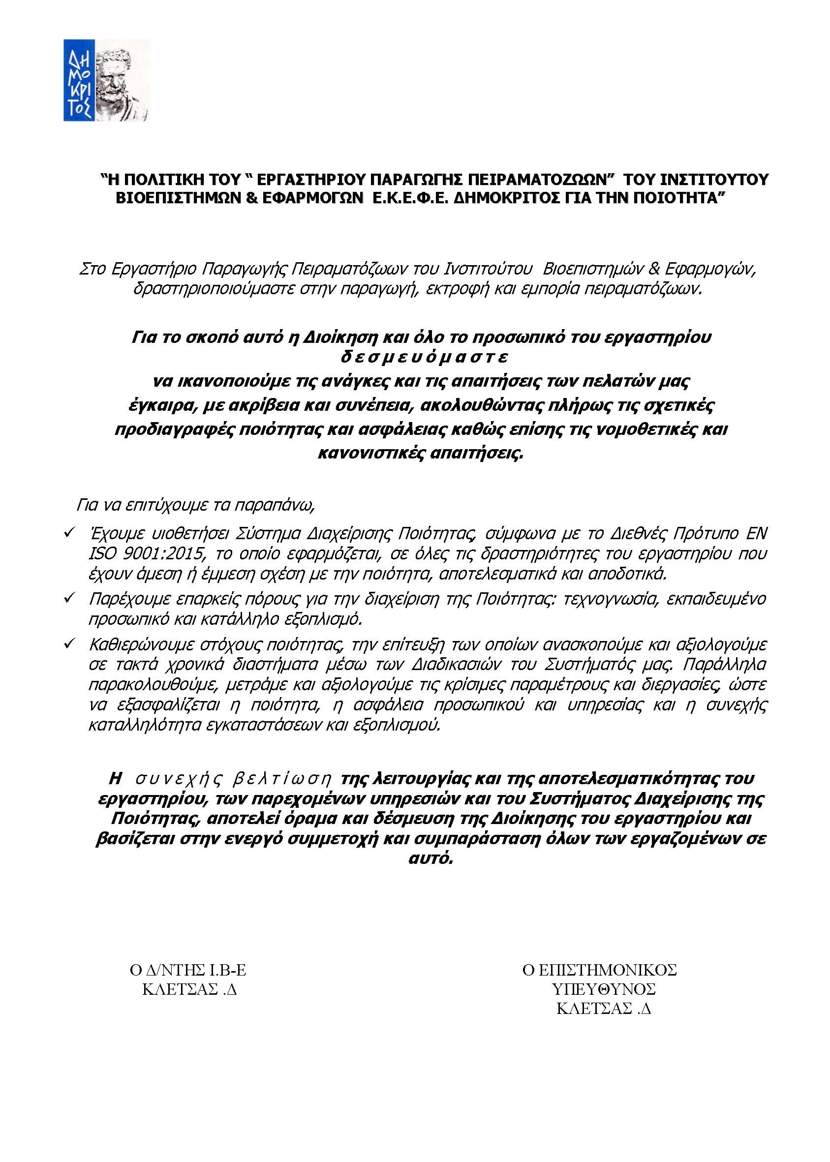 Το Εκτροφείο Πειραματοζώων του Ινστιτούτου Βιοεπιστημών και Εφαρμογών, του Εθνικού Κέντρου Έρευνας Φυσικών Επιστημών “Δημόκριτος”, είναι ένα από τα πρώτα εξειδικευμένα εκτροφεία παραγωγής και διάθεσης πειραματοζώων στην Ελλάδα. Σκοπός του είναι η εκτροφή, η προμήθεια και η χρήση ζώων εργαστηρίου τα οποία χρησιμοποιούνται στην έρευνα και στην ανάπτυξη νέων τεχνολογιών, καθώς και στην εκπαίδευση. Σήμερα, το Εκτροφείο Πειραματοζώων λειτουργεί εναρμονιζόμενο με τις εθνικές και διεθνείς προδιαγραφές λειτουργίας εγκαταστάσεων ζώων εργαστηρίου και καλύπτει τις σύγχρονες απαιτήσεις για έρευνα με ζωϊκά πρότυπα.