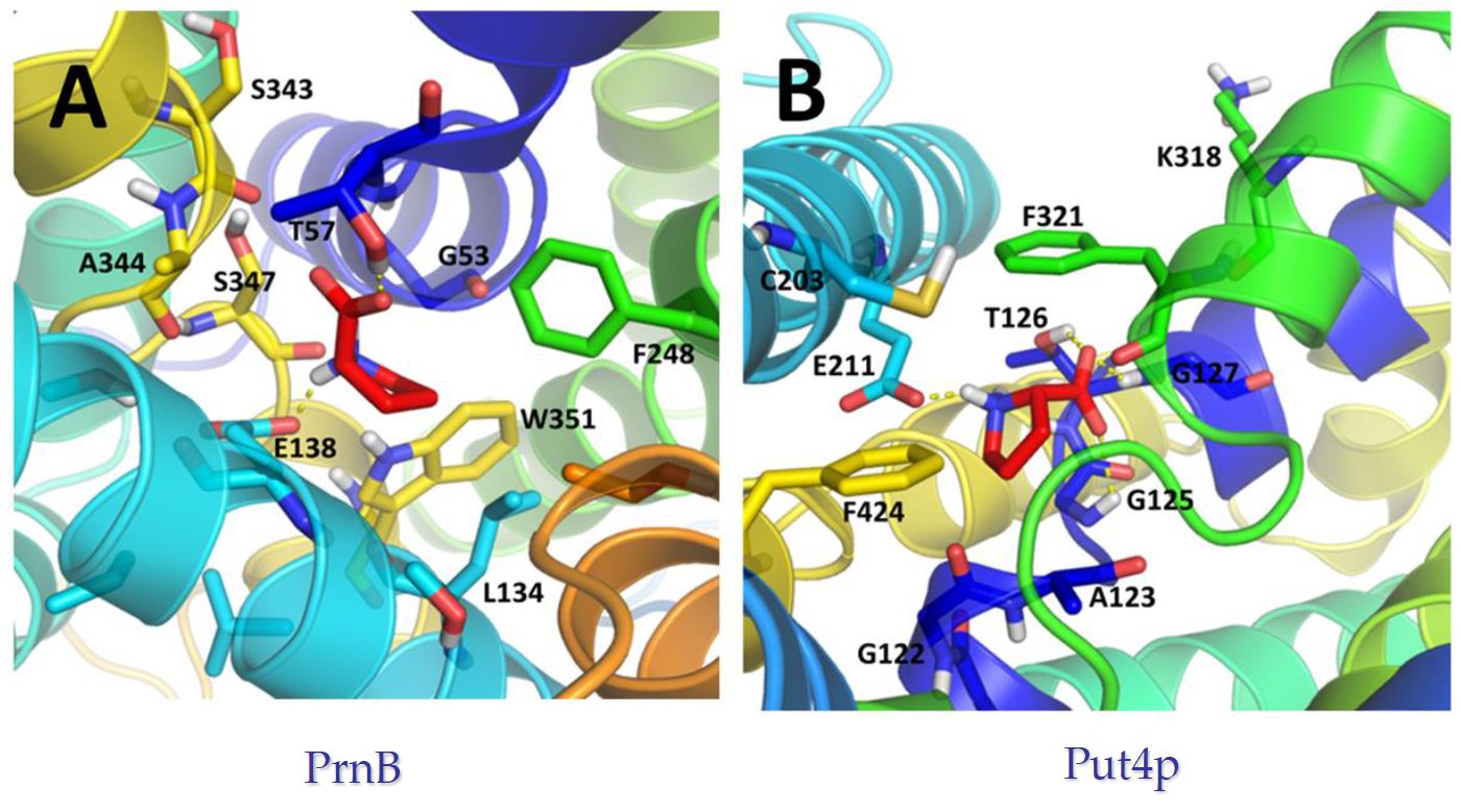 Proline trajectory in PrnB (A) and Put4p (B)
