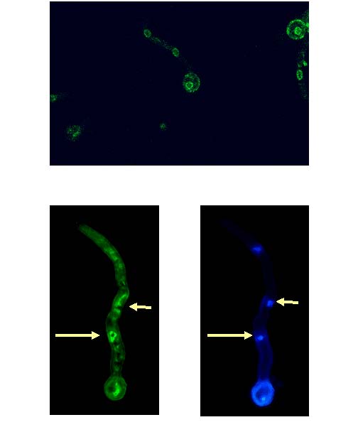 The contribution of our lab in this direction concerns the identification and cloning of GFP-tagged and knocked-out homologues of eisosomal proteins (core: PilA, PilB, SurG and Nce102) in the filamentous Pezizomycotina A. nidulans. In this fungus, in contrast to the Saccharomycotina, the fate of the core eisosomal proteins is developmentally regulated, having a complete different distribution in mycelia and spores (both conidiospores and ascospores) and being absent from hülle cells (Vangelatos et al. 2010, Scazzocchio et al. 2011, Athanasopoulos et al. 2013). PilA is a BAR-domain protein (P. Geranios, 2014, MA thesis) and the A. nidulans orthologue of Nce102p is member of a family of integral membrane proteins containing the MARVEL (MAL and related proteins for vesicle trafficking and membrane link) domain, conserved in fungi and animals, including humans. AnNce102 plays a crucial role in PilA localization and in the stability/number of PilA/SurG foci in the head of germlings generating from conidiospores. In addition, like PilA, AnNce102 genetically interacts with YpkA kinase of TORC2 and negatively regulates sphingolipid biosynthesis (A. Athanasopoulos et al. 2015). Moreover, YpkA kinase repression mimics genetic or pharmacological depletion of sphingolipids, conditions that induce the production of Reactive Oxygen Species (ROS) and can be partially overcome by deletion of pilA and/or annce102 at high temperatures. Consistent with these findings, evidence is provided that pilAΔ and Annce102Δ show differential sensitivity to various oxidative agents, while AnNce102 overexpression can bypass sphingolipid depletion regarding the PilA/SurG foci number and organization, also leading to the ectopic localization of PilA to septa (Athanasopoulos et al. 2015)..