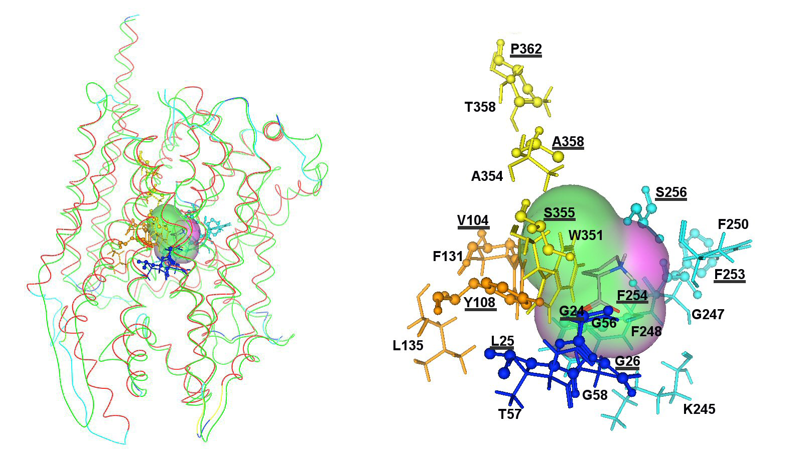 Left: Interactions of APCs with amino acid substrates: the PrnB paradigm. Super-imposition of the LeuT (red line) and PrnB (green line) structures and predicted interactions with proline. Right: Substrate interacting residues are shown in sticks representation for LeuT and ball and sticks representation for PrnB. Residues taken from the X-ray structure of LeuT (rcsb code: 2A65) are underlined.