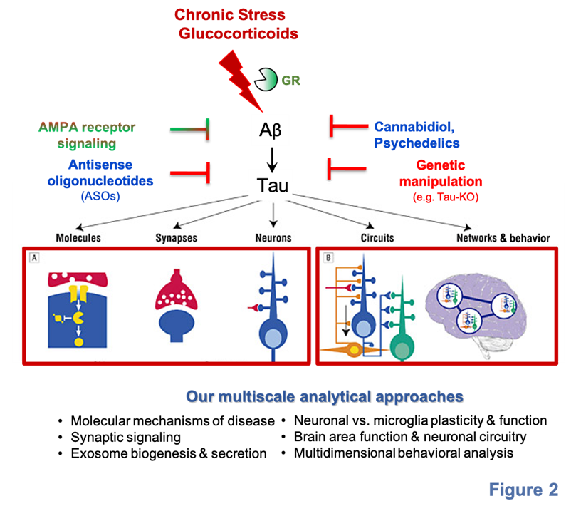 Another part of our work demonstrates novel Tau-dependent mechanisms underlying the stress-driven damage of brain plasticity in the adult brain. Focusing on neuronal synapses, we propose novel mechanisms of stress-induced synaptic dysfunction and atrophy through: a) pathological accumulation of Tau in the synapse that triggers dysregulation of glutamatergic receptor signaling and excitotoxicity (Lopes et al. PNAS 2016; Pinheiro et al, Mol Neurobio 2016) and, b) synaptic mitochondria dysregulation (Lopes et al. Cer Cortex 2016). Regarding neurogenesis, we showed that chronic stress reduces neurogenesis in both the hippocampus and the subventricular zone of the adult brain through the accumulation of hyperphosphorylated 4R-Tau isoform in neuroblasts & newborn neurons. Furthermore, in collaboration with different research institutions and pharma industry in Greece and abroad, the research work of our laboratory also includes the testing of the potent therapeutic or protective action of novel molecules against Stress pathology and AD, including antisense oligonucleotides (ASOs), microneurotrophins, cannabidiol and psychedelic substances (Figure 2).
