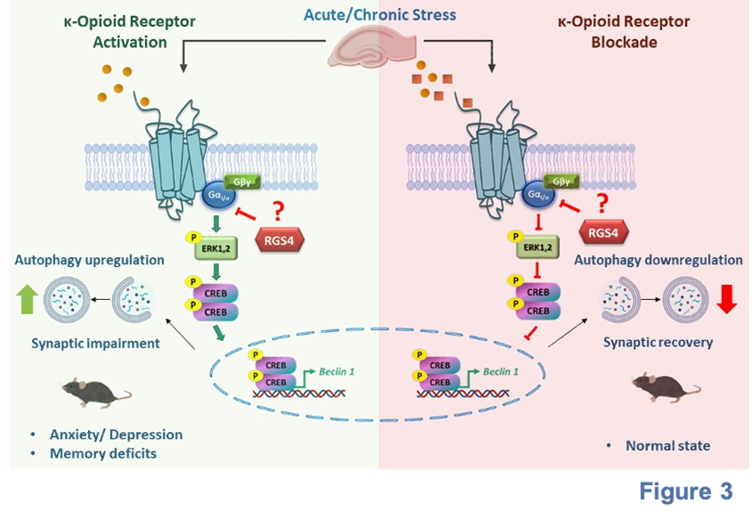 At present, Dr Georgoussi’s team is investigating how alterations in OR signaling result in distinct cellular responses and how opioids are implicated in anxiety and stress-related behaviors. A new signaling pathway has been defined, which induces the autophagic machinery and consequent neuronal synaptic changes upon κ-opioid receptor (κ-ΟR) activation with selective agonists. In a related context, stress exposure was shown to promote κ-OR-dependent autophagy causing neuronal and synaptic changes in specific brain regions, which are reversed upon specific κ-OR antagonist administration with high clinical importance (Karoussiotis et al., 2022) (Figure 3).