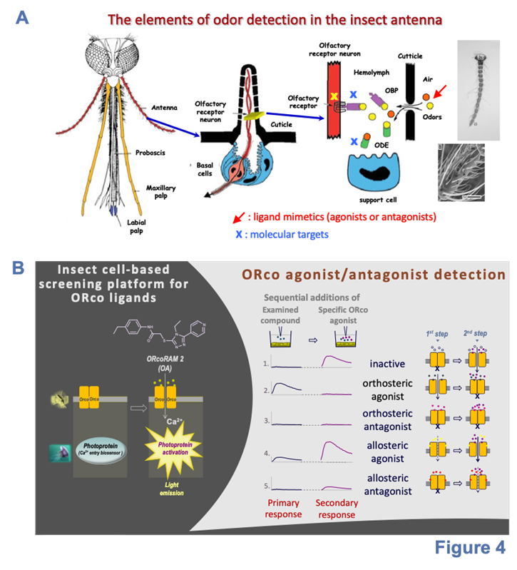The research work led by Prof. Iatrou focuses on the manipulation of the olfactory functions of hematophagous insects with the goal of interfering with them and limit the transmission of infectious diseases to animal and human hosts. Insects have the potential to transmit a large variety of pathogens to humans and animals, causing a variety of vector-borne diseases (VBDs). Οne powerful, effective and safe control method is the use of long lasting and environmentally friendly repellents and anosmia-inducing agents that may interfere with insect olfaction and minimize the ability of mosquitoes and other blood-sucking insects to bite and transfer pathogens to their host organisms – see below, Figure 4.